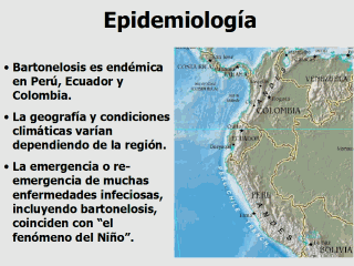 con casos reportados de bartonelosis son Perú, Ecuador y Colombia. Acerca del "fenómeno del Niño", existe evidencia que muestra la influencia de los cambios climáticos y bartonelosis: Zhou J, Laughlin L, Andre R, et al. El Niño and the spread of bartonellosis epidemics in Peru. EOS Trans Am Geophysical Union 2002;83:157, 160-1 Algunas definiciones: Epidemia: número de casos sobre lo esperado en una población específica para un intervalo de tiempo. Endemia: La presencia constante o usual de una infección o enfermedad en una población o comunidad. Epidemiología: es una ciencia cuantitativa subyacente a la salud pública y medicina. Es el estudio de la distribución y determinantes de una enfermedad o eventos relacionados a la salud en poblaciones específicas y la aplicación de este estudio al control de los problemas de salud. |