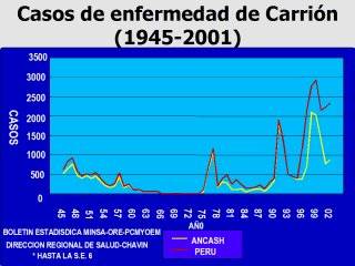 1994. Después del último "fenómeno del Niño" (1993) hubieron muchos reportes de nuevos casos de bartonelosis. Sorprendentemente, esos nuevos casos fueron localizados en otros departamentos pertenecientes a la región de la selva. |