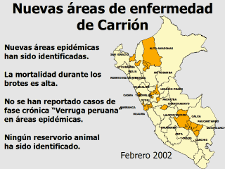 de viviendas vecinas. Chamberlin J, Laughlin L, Romero S, Solorzano N, Gordon S, Andre R, Pachas P, Friedman H, Ponce C, Watts D. Epidemiology of endemic Bartonella bacilliformis: a prospective cohort study in a peruvian mountain valley community. JID 2002;186:983-90 Birtles R, Canales J, Ventosilla P, Alvarez E, Guerra H, Llanos A, Raoult D, Doshi N, Harrison T. Survey of Bartonella species infecting intradomicillary animals in the Huayllacallan valley, Ancash, Perú, a region endemic for human bartonellosis. Am J Trop Med Hyg 1999; 60: 799-805 |