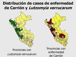| La distribución de la enfermedad de Carrión y Lutzomyia verrucarum es diferente como se observa en los mapas. En otras áreas como en Cusco, no fue posible encontrar Lutzomya verrucarum, por lo que otro vector sospechoso puede ser Lutzomyia peruensis. |