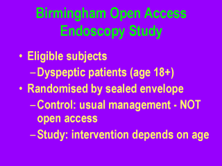presentation. Randomisation was at the individual patient level . Initial endoscopy trial: