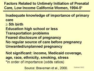 prenatal care delivery. Source: Braveman P, Marchi K, Egerter S, Pearl M, Neuhaus J. Barriers to timely prenatal care among women with insurance: the importance of prepregnancy factors. Obstet Gynecol 2000; 95(6 Pt 1):874-880. |