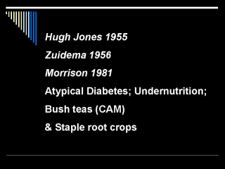| Some 50 years ago, an atypical pattern of diabetes mellitus was described by Hugh Jones, the J-type. Soon after Zuidema wrote similarly about a Z-type and several others were to write confirming these atypia. In 1981, Morrison wrote of a formes frustes in Jamaica, and published supportive laboratory findings for the aetiology by 1986. |