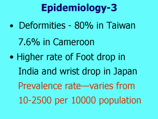 Leprosy prevalence rate varies from 1-50 per 1000 (Noordeen 1985), 250 per 1000 ( Sansarricq,1961) ftp://ftp.hrsa.gov/bphc/pdf/nhdp/HD_SEMINAR.pdf http://bphc.hrsa.gov/nhdp/Print_Material_OUTREACH.htm 1. Leprosy for medical practitioners and paramedical workers by SJ Yawalkar, 7th Edition, 2002, published by Novartis Foundation for Sustainable Development, Basle, Switzerland. 2. Leprosy: Edited by Robert C Hastings, 1st Edition, 1985 3. Biology of the Mycobacteria: vol.3. Edited by Colin Ratledge, John Stanford and John Grange, 1989. Academic press. |