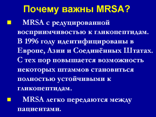 | Гликопептиды – группа противомикробных препаратов, включающая ванкомицин и тейкопланин. Они являются ингибиторами синтеза клеточной стенки. Термин “glycopeptide-intermediate S. aureus (GISA)” был принят для обозначения штаммов MRSA с редуцированной чувствительностью к гликопептидам. |