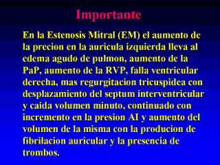 | El monitoreo invasivo con el cateter en la arteria pulmonar puede ser suceptible de ruptura con el cateter por dilatacion en la arteria pulmonar.Y debe considerarse que la presion de eclavamiento sobreestima la presion de llenado del VI por la presencia de estenosis. |