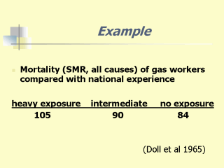 | As an example is the study of Doll and coworkers on gas workers exposed to carbonised coal. They measured SMR for groups of gasworkers with different exposure. |