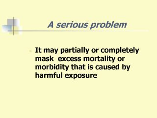 | So this reduction in SMR could be described as a negative effect of exposure-outcome association or in other terms it might said that the condition among the workers is good and no harmful effect was seen. And of course it is not true. |