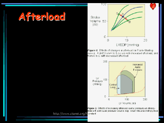 Afterload is increased when aortic pressure and systemic vascular resistance are increased, by aortic valve stenosis, and by ventricular dilation. When afterload increases, there is an increase in end-systolic volume and a decrease in stroke volume. As shown in Figure 1, an increase in afterload shifts the Frank-Starling curve down and to the right. The basis for this is found in the force-velocity relationship for cardiac myocytes. Briefly, an increase in afterload decreases the velocity of fiber shortening. Because the period of time available for ejection is finite (~150-200 msec), a decrease in fiber shortening velocity reduces the rate of volume ejection so that more blood is left within the ventricle at the end of systole (increase end-systolic volume). Inotropy is not directly altered, except for the possibility of a mild Anrep effect.