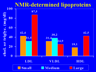 the levels of NMR-determined lipoproteins among women age of about 60 years. Large LDL, which is hypothesized to have no relationship with atherosclerosis, is the major LDL in older women. Small LDL may be the most atherogenic particle. |