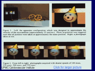 which EBCT images the heart: 100 msec, is almost looking at still motion. As soon as you go to 250 msec which is even faster than a traditional spiral CT can do right now, it starts to get blurring and lose resolution. In analyzing average motions of all the coronary arteries in one complete heart beat, LAD is the slowest moving and therefore easiest to image, circumflex moves faster, and RCA is the fastest. Thus the imaging of RCA is the hardest. During each cardiac cycle, the ideal time to image RCA corresponds to the area of lowest velocity; this point in time corresponds to end systolic or the U wave on the ECG. This period time is less than 100 msec. |