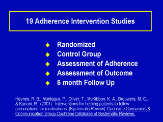 Interestingly, for a millennium old problem, as of 2001, the most recent data, there have been only 19 adherence intervention studies that were randomized, had a control group, assessed adherence as opposed to only assessing clinical outcomes, also assessed outcomes, and provided a six month follow-up beyond the end of treatment to look at the stability of intervention assessment over time. There were only 19 studies that have been reported in the literature that set those criteria.