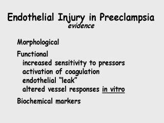If you go from pathology to pathophysiology, you find that there’s a reduction of blood flow to virtually all of the organs of the preeclamptic woman: not just her uterus, but her brain, her liver, her kidneys. That’s due to increased sensitivity to pressors. The blood pressure increase and the narrowing of blood vessels are not because of mysterious toxins or even increased concentrations of usual pressors, but because the vessels are exquisitely sensitive to any agent you administer. In addition to vasoconstriction, you can demonstrate activation of coagulation cascade, which is going to suggest that the women are clotting their blood in vivo, and those little clots further compromise blood flow. Then, the perfusion is reduced because fluid leaks out of the vascular compartment, again, a further compromise of perfusion.