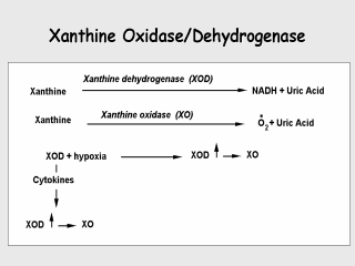 | We looked at some evidence of that. Xanthine Oxidase/Dehydrogenase is an enzyme that’s important in generating free radicals. It exists in two forms. One, where it just makes NADH and uric acid, but the other is the generator of the free radicals and peroxide. Oxidative stress occurs when you have lots of free radicals around. The idea is that in certain settings, like hypoxia, this enzyme increases but is preferentially in this form that makes Xanthine Oxidase. |
