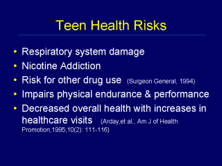 | For the adult smoker, we know that smoking is the leading cause of death and morbidity, particularly with regard to cardiovascular and pulmonary disorders, and cancer. However, there are acute health effects noticeable in the teen smoker. These include early respiratory damage, nicotine addiction, risk for other drug use, performance deficits, and decreased overall health, which has been reflected in increased healthcare utilization. |