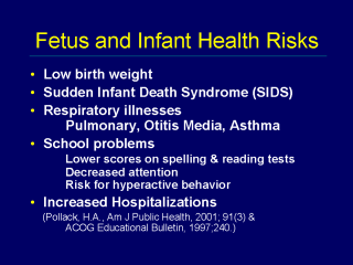 infants are also affected by tobacco use by their mother and others in their environment. Low birth weight may be due to: 1. Low maternal weight gain 2. Vasoconstriction and/or decreased uterine blood flow 3. Carbon monoxide toxicity 4. Increased cyanide exposure from smoking Other health risks include: - Sudden infant death syndrome - Respiratory illnesses, particularly pulmonary and ear infections, as well as asthma - School problems, such as lower scores on spelling & reading tests, decreased attention and a risk for hyperactive behavior - Finally, infants are at risk for increased hospitalizations due to passive exposure to tobacco smoke. |