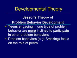 | Jessor’s theory of problem behavior development was used as the conceptual underpinning for this project. According Jessor and his colleagues, teens who engage in one type of problem behavior are more likely to initiate other problem behaviors. These problem behaviors focus on the role of the teen’s peers. |
