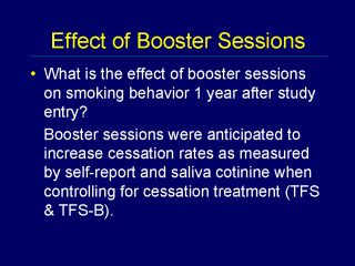 behavior 12 months following study entry. Booster sessions were anticipated to increase cessation rates as measured by self-report and saliva cotinine when controlling for cessation treatment (TFS & TFS-B). |