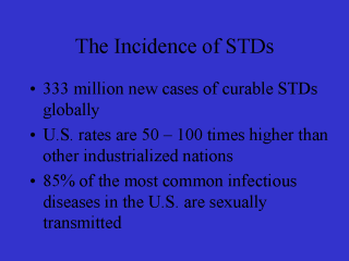 | In order to really understand PID, we really have to step back from those statistics and think about sexually transmitted diseases in general, and particularly those bacterial STDs, Gonorrhea and Chlamydia. These two STDs are exceedingly common worldwide. One third of a billion new cases of curable STDs occur every year. Unfortunately, the U.S. has nothing to brag about in this respect; our rates are 50 to 100 times higher than other industrialized nations. |