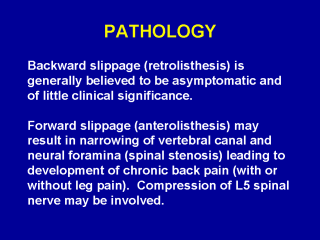 | Now the slippage can occur either backwards which is called retrolisthesis or anteriorly forward which is called anterolisthesis. It is interesting that in the literature what you will find is that everybody says that retrolisthesis is totally asymptomatic. Forward slippage is believed to both narrowing in the vertebral canal and may lead to chronic back pain. |