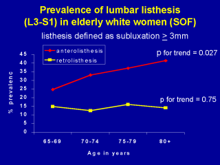 | I would like to show you some of the work that we did in SOF. This is with white elderly ladies in SOF, usually ladies from the Mon Valley. Anterolisthesis is this red line here, as you can see that the prevalence range is from about 22% up to almost 40% at age 80. Retrolisthesis it stays around about 10%, is somewhat less prevalent. |
