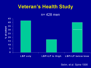 | I just wanted to show you a little bit about some of the work that’s been on leg pain. This is looking at symptoms rather than looking at radiographic changes. This is the Veteran’s Health Study that was done in 1998. These are men who have chronic back pain. As you can about somewhat more than half of them also have leg pain. I just want to show you what impact this has on their health functioning. |