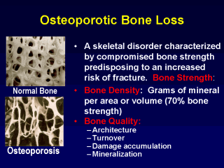 These figures illustrate the changes in bone architecture at the microscopic level that are characteristic of osteoporosis. Normal trabecular bone, as shown on the left, appears as a dense network of thick trabeculae with small spaces. Osteoporotic trabecular bone, on the right, shows clear loss of bone, with large spaces and perforation of the trabecular network (see arrows). These perforations lead to weakened bone, and ultimately to fractures. This bone loss and architectural damage is relatively rapid in the perimenopausal phase of PMO and has been reported to be rapid in patients initiating chronic glucocorticoid therapy. |