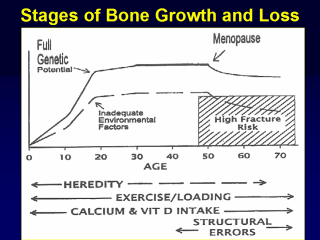 more bone tissue is laid down than is removed. By about age 20, we reach what is called our ‘peak bone density’ and our bones are probably the strongest they will ever be. After age 20, we maintain our bone density for a while, and then bone removal starts to overtake replacement and both men and women will lose bone. Women, however, will have an additional rapid period of loss around the menopause due to the sharp decline in ovarian production of estrogen, a hormone which we know has a protective effect on bone. Low bone mass results either from failure to achieve peak bone mass during the first 30 years of life, or from rapid, or accelerated bone loss later in life. Once you reach what is called ‘your fracture threshold’ (loss of ~50%of bone mass), you are at risk of higher rate of Fx. Following attainment of PBM, a gradual loss of bone occurs with ageing. Before the menopause, the amount lost is very small but it then increases to approximately 1-2% per annum over the next 5-10 years. These respective changes in bone mass with the menopause have resulted in enormous interest over the last two decades as to the effectiveness of calcium supplementation in reducing perimenopausal bone loss. |