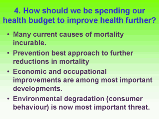What does all this suggest for the way we should be spending our money on health? In HK, 90% of the money allocated to health care is spent by the hospital authority, and only 10% goes to the Department of Health. There are other areas that receive funding not explicitly under the health care budget, which make an important contribution to health, such as education, social services, urban services, such as sanitation and infra-structural maintenance including water and sewerage.