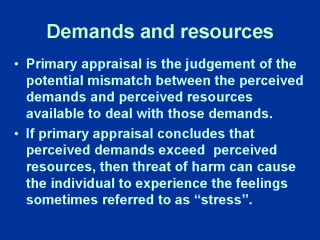 extent of control over demands becomes more marginal). When perceived demands exceed perceived resources, then the symptoms also referred to as “stress” begin to appear. These include decrements in performance and function, subjective feelings of tension, fatigue, irritability, anxiety and depression, and sleep disruption. (Note how the word stress is used to refer to both the “cause” and also to the “effect” - it is a very imprecise term and made largely useless as a result of such misuse and misunderstanding). Thus, the process of primary appraisal is the estimation of the extent of potential harm. This initiates coping responses, activity to deal with or respond to the perceived demands. So, to summarize so far, when people perceived that the demands they face exceed the resources the perceive they have available to cope, they experience the disturbance called stress. Threat is the potential for harm which is anticipated to occur if coping responses are unsuccessful in avoiding, deflecting or minimizing the threatened harm. |
