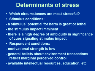all, a situation called helplessness, which is a risk factor for depression!!). Stimulus conditions which indicate potential for serious harm that is imminent and for which there is little or no clear warning, coupled with respondent (personal) conditions where the person’s belief about environmental events is that they are seldom or only marginally controllable, where they have little motivation to try to respond, and where available intellectual resources are low, are the circumstances that generate most stress for a majority of organisms. Of course, most of these criteria have been determined in laboratory experimentation and in the real world, circumstances are much less “pure” and difficult to study. Can you think of examples of real world circumstances which have the features of these high stress situations? How do you think a person embodying the TABP views the world? The TABP description certainly suggests that they might perceive the stimulus conditions and the borderline control respondent feature described in the slide. Under borderline control conditions individuals often strive to maintain control and implement problem-focussed coping. Where control is impossible, problem-focused coping is pointless, so persons may become passive or adopt other emotion-focused coping. If an individual comes to believe their world is mostly uncontrollable, they may try to exert control through superstitious acts, like making offerings to gods for luck, or they may become quite fatalistic and passive in the face of demands. At other times they may seek other persons whom they believe can exert control, such as doctors, if the problem is perceived as a health problem.Studies of people caring for relatives with Alzheimer’s disease, who face continual demands from having to provide continuous round the clock care and watch loved ones deteriorate, have shown they have poorer immune function and slower wound healing times compared to controls. |