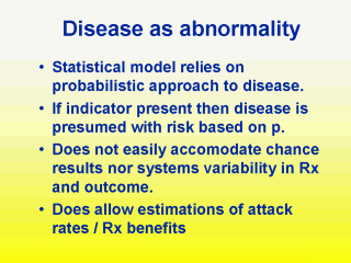 when. Probabilistic models cannot answer this latter point very well. Probabilistic models do not easily handle extreme chance scores, nor do they transfer well to other systems. Some systems are inherently more variable than others, and some tests are more accurate than others. This view also doesn't comfortably allow estimates of such important data as disease attack rates or the extent of treatment benefits. To help overcome some of these shortcomings, epidemiologists use two measures of tests, sensitivity and specificity, to help determine how valuable a test will be in predicting who will develop the disease (Positive Predictive Value - PPV) and who will not. |