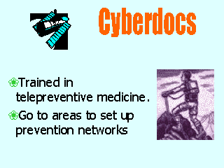 Wir entwickeln eine neue Disziplin, die sogenannte Tele-Präventivmedizin. Zur Zeit beginnen wir damit, Fachleute auf diesem Gebiet auszubilden. Diese 'Cyberdocs' sind Spezialisten aus den Gebieten Medizin, Veterinärmedizin, oder Public Health, die zusätzlich in Telekommunikation ausgebildet werden.