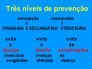 Prevenção Primária: age em pessoas sadias, evita a doença reduzindo a susceptibilidade ou a exposição ao fator de risco. Seu tempo é principalmente pré-concepcional e evita os defeitos congênitos.