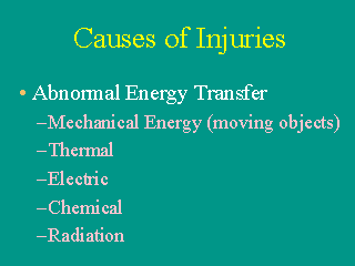 All injuries can be characterized from the perspective of an abnormal transfer of energy. For example, the catastrophic injuries arising from plane or automobile crashes can be characterized as injuries which arise from the transfer of energy between the victim and a stationary object (the ground) or a moving object (another vehicle), which lead to trauma and possibly death. Interference with normal energy exchange may also result in injuries through drowning and frostbite. |