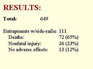 rather than the side-rail. Of the 97 events with dates, 78 (80%) occurred after January 1, 1992. The cause of death was reported for 38 of the 72 fatalities. The cause of 32 was asphyxiation, strangulation, or suffocation. The others died of cardiac arrest, arrhythmias, or pneumonia. Of the 26 injuries reported, there were respiratory or circulatory compromise (12), skin or soft tissue injury (8), and fractures and sprains (5). The 13 entrapments that had no adverse effects were due to the fact that staff intervened. |