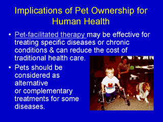 The study of human-animal interactions and their implications for human health must be a joint venture between physicians, veterinarians, epidemiologists, and behavioral scientists. Even a small improvement in human health resulting from animal companionship is of substantial public health significance, given the large proportion of households that currently own pets. |