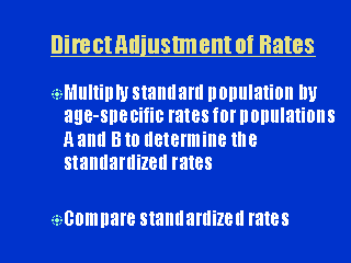 Direct adjustment of rates for two communities is performed by multiplying the age distribution for the standard population to the age-specific rates first for population A,and then for B to determine the two standardized rates. These standardized rates are then compared. An example of direct adjustment of rates is shown in slides 16 and 17. |