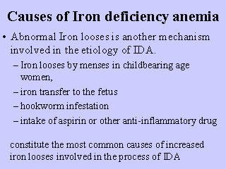 the ethiology of IDA. Iron looses by menses in childbearing age women, iron transfer to the fetus during pregnancy, hookworm infestation or intake of aspirin or other anti-inflammatory drug constitute the most common causes of increased iron looses involved in the process of IDA. Their participation in the process of ID is different; for example hookworm infestation is observed in developing countries, or the amount of iron lost by menses vary with woman’s contraceptive practices. The loose of iron estimated in healthy adult man is approximately 1mg/day (Green et al, 1968) and additional loose of 0.5 mg/day in women (Hallberg et al. 1988). Hallberg estimated that from 1040 mg of iron needed for a pregnancy, 840 mg are lost permanently and 200 retained. Based on the amount of Iron bioavailable, diets can be divided into low (5%), intermediate (10%) and high (15%) iron bioavailable. |