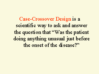 For example, to find out what might trigger the onset of myocardial infarction, we may wonder if the patient endured certain heavy physical activity, or if he/she consumed specific type of food right before the disease. If we can gather the so called "exposure" information from many patients, it is possible to determine the effect of the event or "attitude" on the onset of disease. |
