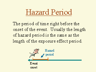 The hazard period is the period of time right before the event onset and its length is the same as the length of exposure effect period. It is hypothesized that, during this period of time, the individual is most likely exposed to certain agent which triggers the onset of the event. Thus we are interested to know if the individuals had exposure in this period of time or not. |