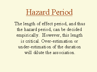 The length of the hazard period can be decided according to the investigator’s past experience. The length of this period is very important. If the duration is overestimated, many "false exposures" will become "exposures". If the duration is underestimated, some of the "true exposures" will be excluded. When either of these occur, the association between the event and exposure can’t be evaluated correctly. |