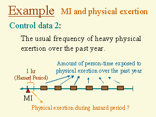 The other type of control data they used is the patient’s usual frequency of physical exertion over the past year. The idea is to compare the amount of time exposed to exertion and the amount of time not exposed to exertion over the past with the information of whether there was exertion during the hazard period. Since here "person-time" exposed to exertion is used, the design is rather like a "cohort" study than a traditional case-control study, and the analysis for this type of control data will also be more like a cohort study analysis.