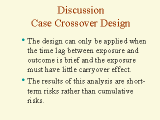 - Because of the above conditions, the results from a case crossover analysis only represent short-term risk but not cumulative risk, and relative risk but not absolute risk.