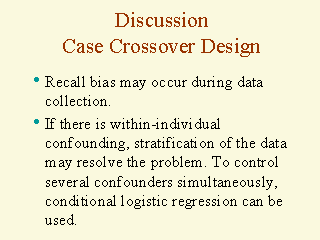 - In the design each individual serves as his/her own control and this can eliminate confounding by subject characteristics. But if there is certain characteristics which change over time in the individual, self control can’t adjust for this. For example, an individual usually drinking coffee after exercise represents a within-individual confounding, since it is difficult to distinguish whether coffee consumption or exercise causes the outcome of interest. If this happens, one can stratify the data or use conditional logistic regression to adjust for the confounding.