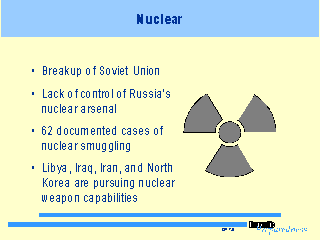 Over the past few years, there have been over 62 documented cases of nuclear smuggling worldwide. Countries such as Libya, Iraq, Iran, and North Korea are aggressively pursuing nuclear weapon capabilities.