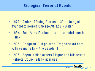 - In 1972, an American Fascist group, the “Order of the Rising Sun”, used 30 to 40 kilograms (kg) of typhoid to contaminate the Chicago and St. Louis water supplies. - In 1984, the “Red Army Faction” is alleged to have tried to use botulinum toxin in Paris. - In 1986, 715 people became ill in Oregon when the Bhagwan Cult poisoned salad bars with salmonella. - In 1995, a member of the Aryan Nation was arrested for ordering plague from a supply house in Maryland. Two members of the Minnesota Patriots Council were convicted for planning to use ricin in an assassination attempt. |