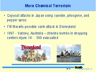 The Tokyo subway incident on March 20, 1995, is the most publicized of all the incidents and marks the beginning of a new era in terrorism. After the Tokyo attack, copycat attacks occurred in Japan with the use of cyanide, phosgene, and pepper spray. An FBI action forestalled a possible sarin attack in Disneyland shortly thereafter. The most recent terrorist use of a chemical was in Sydney, Australia. In 1997, two chlorine bombs were activated in shopping malls, injuring 14 and forcing the evacuation of 500 persons.