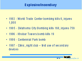 The World Trade Center Bombing in 1993 killed 6 and injured over 1,000 people. One month after the Tokyo subway attack, the Murrah Federal Building in Oklahoma City was bombed, killing 168 people and injuring more than 750. The U.S. government realized that terror could strike at America’s heartland. Americans are at risk at home and abroad. The rules of engagement have changed. - In June 1996, the bombing of Khobar Towers in Dharhan killed 19 U.S. airmen. - A bomb attack at the Olympic Centennial Park in - Atlanta altered our sense of security. - First responders (fire, EMS and law enforcement) were targeted for the first time in the U.S. while responding to terrorist attacks. A secondary device was aimed at responders in the 1997 bombings of an Atlanta clinic and a nightclub. - This raises the possibility that any healthcare provider, including hospitals and clinics may be targetted for such attacks. |