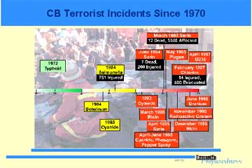 - This time line shows the increase of terrorist activities involving NBC agents. There was only one reported NBC event in the 1970s, three in the ‘80s, and an exponential increase of events in the ‘90s.